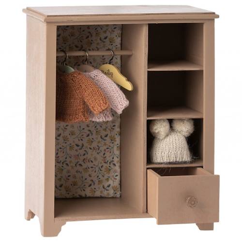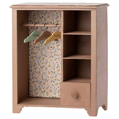 ארון בגדים, גדול – פודרה Maileg ארון בגדים זה ידאג שלחבריך הקטנים יהיה מקום לשים את הבגדים והאביזרים שלהם. הקיר האחורי בפנים מכוסה בבד מיילג יפהפה. כלולים 3 קולבים קטנים בצבעים שונים. פריט משחק או פריט עיצובי לכל חדר – פשוט מושלם!