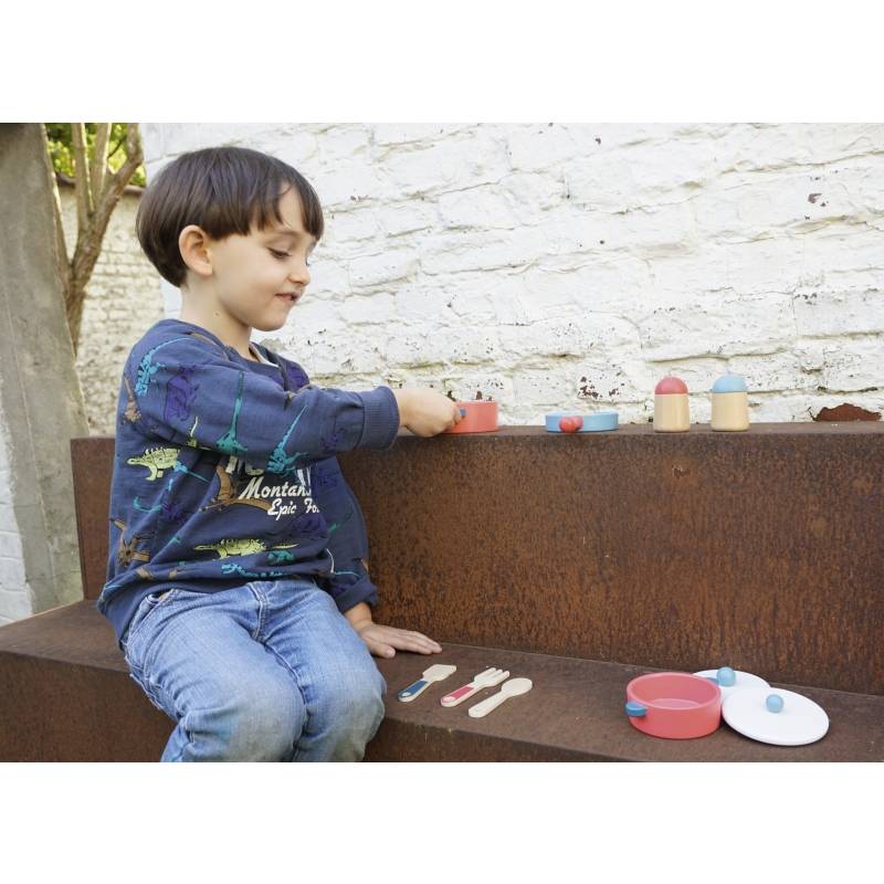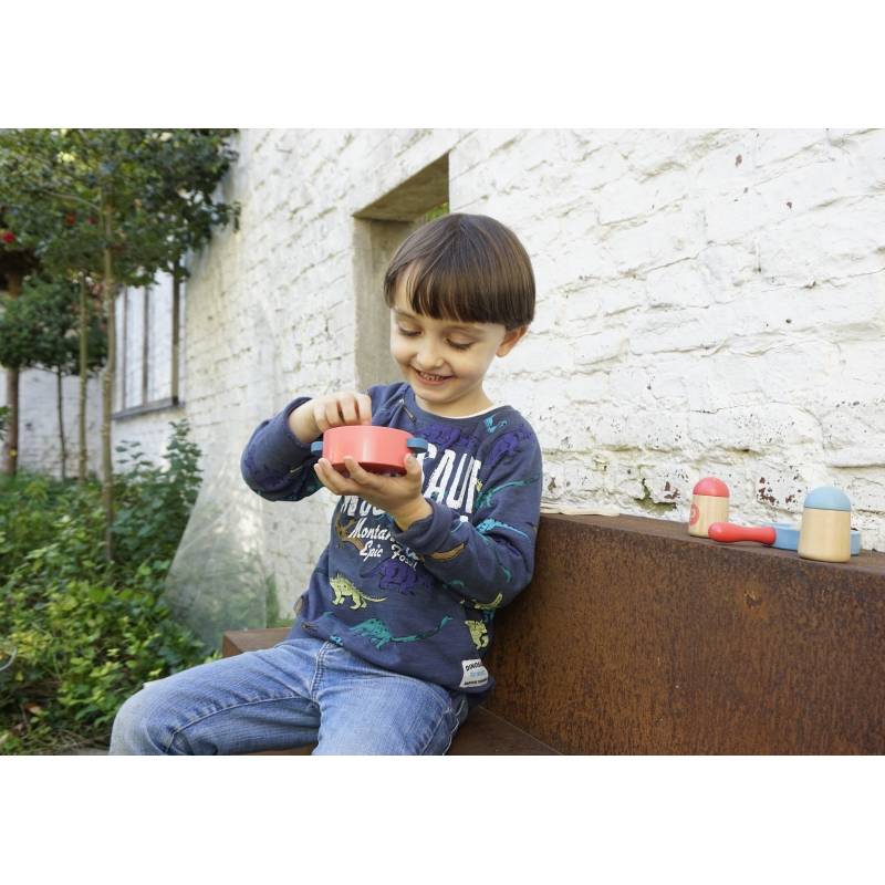 סט סירים ומחבת מעץ EGMONT כל מה שהשף הקטן צריך להכנת ארוחת ערב טעימה: קדירה, מחבת, סיר, כפןת, מלח פלפל, סכו"ם וביצת עין טעימה. ארוז באריזת וינטאג' מתוקה.