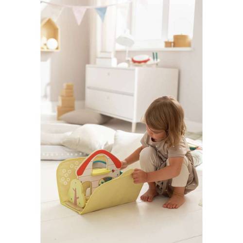סט משחק חווה צבעוני מבית Hape המיועד לפעוטות מגיל שנה עד שלוש – כולל חווה, שטיח משחק טקסטילי, בעלי חיים ואביזרים חקלאיים.