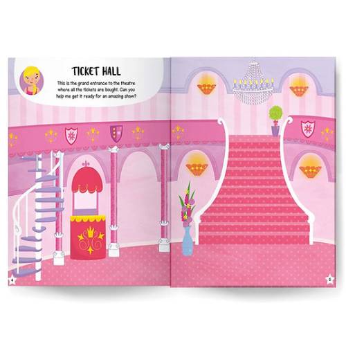 חוברת מדבקות מקסימה שבה מעצבים 7 חדרים ואולמות בתיאטרון בו מופיעות הבלרינות.