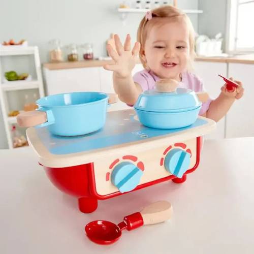 ערכת משחק מטבח מעץ לילדים מבית Hape שמזמינה את הפעוט להכין “ארוחות” דמיוניות בדיוק כמו במטבח האמיתי.