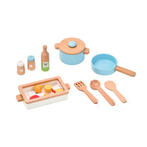 הסט כולל: קופסת אוכל, סיר עם מכסה, מחבת, מלח, פלפל, בקבוק שמן זית, 3 כלי אוכל, 4 חתיכות תפוח אדמה, 3 פרוסות עגבניה ו- 3 פרוסות פטריות.