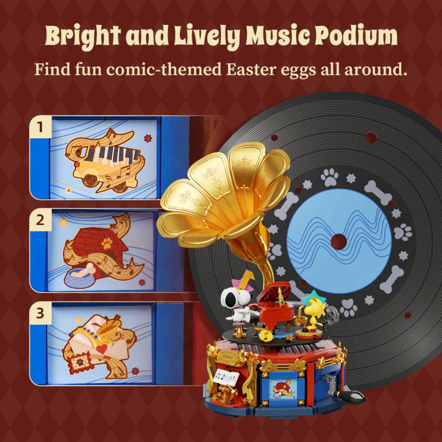 ערכת הבנייה הזו כוללת כ־800 חלקים איכותיים להרכבת פטיפון וינטג’י עם תקליטים צבעוניים ודמויות אהובות: סנופי, צ’ארלי בראון, לוסי ווודסטוק.